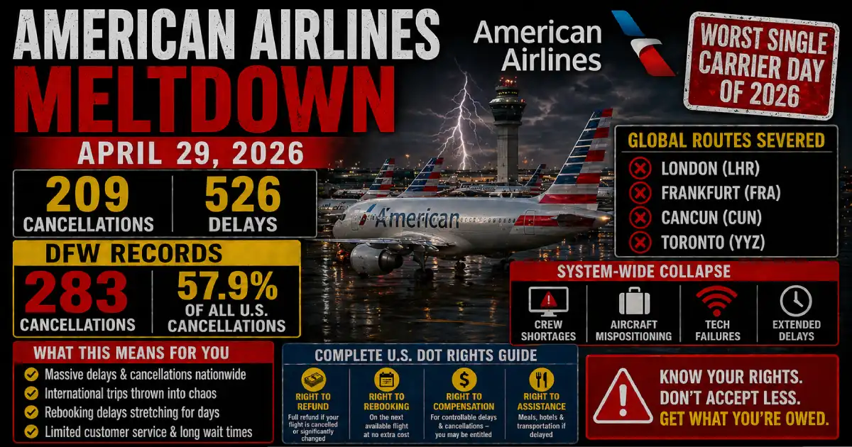 Published: April 29, 2026 π΄ ACTIVE DISRUPTIONΒ American Airlines National Total: 735 disruptions (209 cancellations + 526 delays) Context: Worst single carrier day of 2026 β surpasses Easter Saturday for AA cancellation count DFW Cancellations: 283 β 57.9% of ALL US cancellations today β worst single-airport day of the entire 2026 crisis DFW Total Disruptions: 720 (437 delays + 283 cancellations) Chicago O’Hare (AA secondary hub): 318 delays + 110 cancellations total airport Charlotte (CLT β AA hub): Cascading delays from DFW and ORD arriving Miami (MIA β AA hub): Delays accumulating from domestic cascade Raleigh-Durham (RDU): 3 AA cancellations + 7 delays β Frankfurt and Mexico City routes severed Minneapolis (MSP): 2 AA cancellations + 3 delays β Dublin, Paris, Toronto, Amsterdam ripple Denver (DEN): 12 AA delays + 2 cancellations β 26% cancellation rate International Routes Severed: London Heathrow (LHR) Β· Frankfurt (FRA) Β· Mexico City (MEX) Β· Cancun (CUN) Β· Toronto (YYZ) Β· Dublin (DUB) Β· Paris CDG (CDG) Β· Helsinki (HEL) Β· Incheon (ICN) Β· San Juan (SJU) AA Travel Waiver: β LIVE β check aa.com/travelinfo NOW DOT Cash Refund Rule: β MANDATORY for all AA-cancelled flights regardless of cause Cause: Severe thunderstorms over Chicago + ATC capacity restrictions at DFW + 29-day accumulated positioning deficit