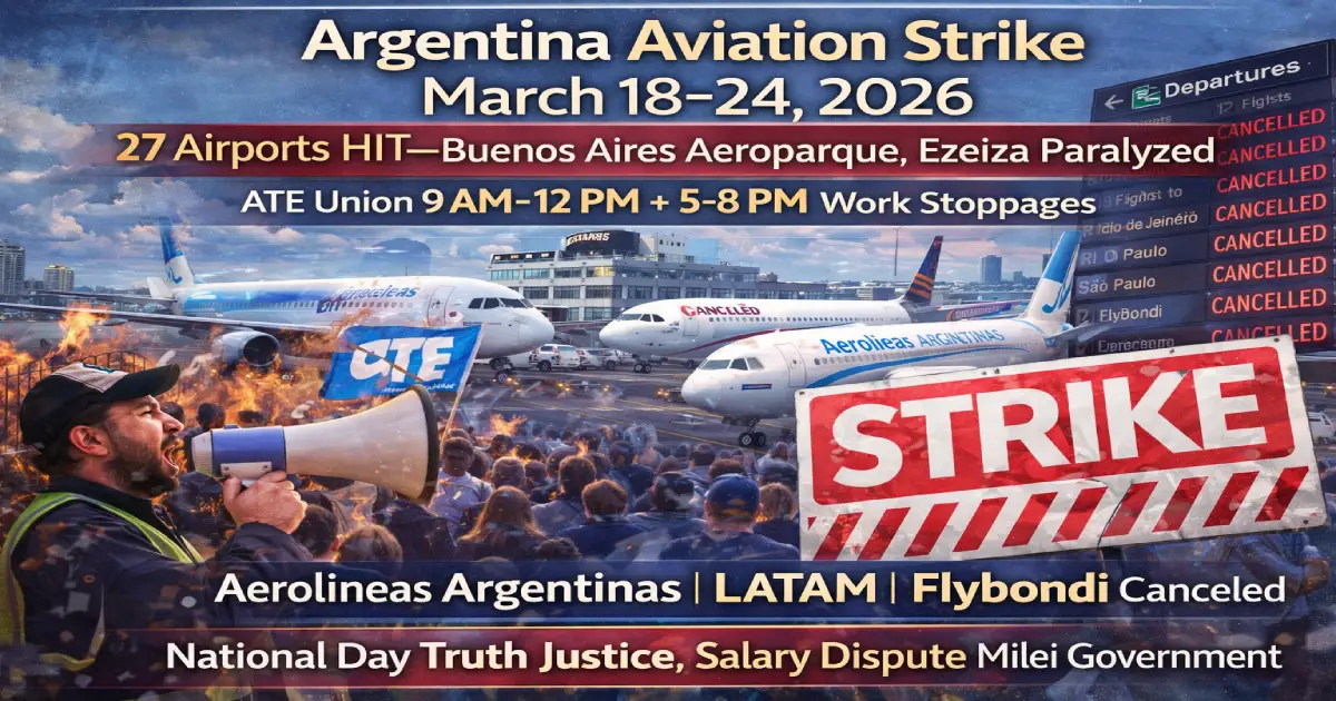 Breaking: Argentina’s aviation system faces 7-day paralysis (March 18-24, 2026) as State Workers Association (ATE) union launches nationwide strike affecting 27 of 35 commercial airports, implementing work stoppages 9:00 AM-12:00 PM + 5:00-8:00 PM daily, crippling Buenos Aires Aeroparque and Ezeiza International (South America’s major hubs), forcing cancellations across Aerolíneas Argentinas, LATAM, Flybondi, and international carriers during Argentina’s four-day long weekend (National Day of Remembrance for Truth and Justice). Airport healthcare workers, firefighters, inspectors, administrative staff, and land control personnel walk out after President Javier Milei’s government failed to pay agreed salary raise, creating cascading chaos for thousands of international passengers connecting through Buenos Aires. Here’s what every traveler needs to know now.