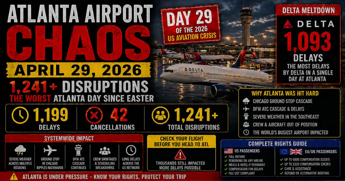 Breaking — April 29, 2026: Hartsfield-Jackson Atlanta International Airport — the world’s busiest aviation hub — is recording a catastrophic 1,241 to 1,320 disruptions today (live count updating — see note below), including 1,093 delays from Delta Air Lines alone. Delta’s 1,093-delay figure is the highest single-carrier, single-airport delay count recorded at any US hub during the entire 29-day post-Easter crisis — surpassing even the worst Southwest days at O’Hare and the worst United days at Newark. The national picture is equally severe: 4,173 delays + 489 cancellations = 4,662 total US disruptions today, with Dallas–Fort Worth recording the highest single-airport cancellation count of the entire 2026 crisis at 283 cancellations. Atlanta is the delay capital of America today. DFW is the cancellation capital. Together they are driving a national aviation emergency that is reaching across continents — disrupting routes to London, Paris, Amsterdam, Seoul, Lagos, Toronto, Mexico City, and dozens more international destinations. This is every number, every carrier, every route, and every right you hold.