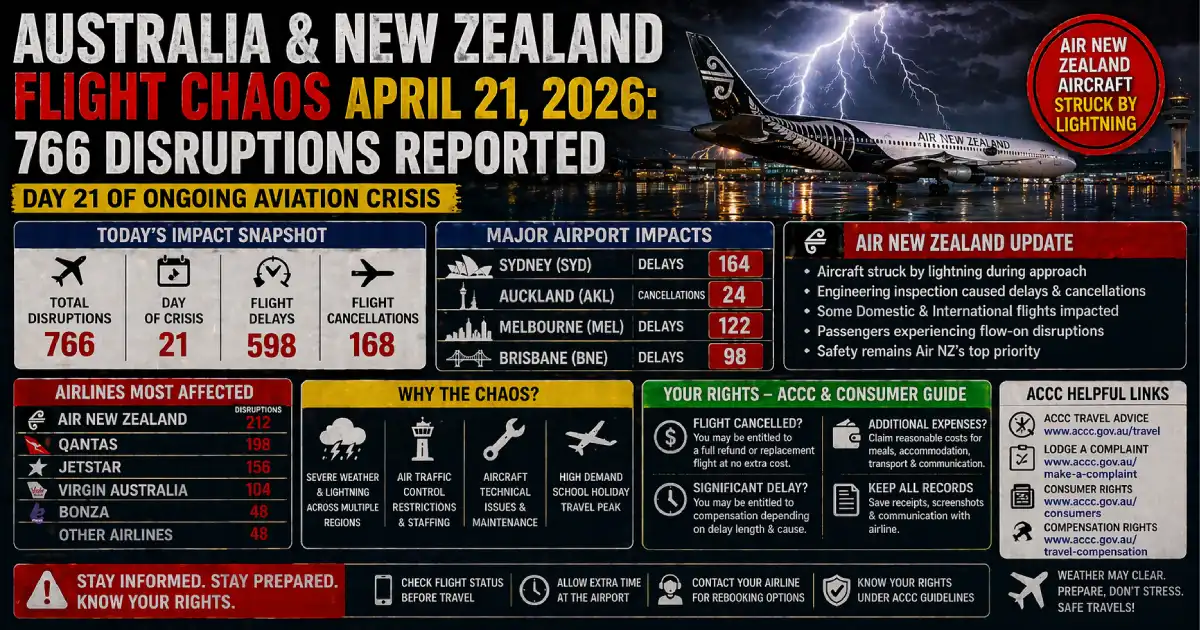 Day 21 is the worst single day of the AustraliaβNew Zealand aviation crisis since April 14 β 766 total disruptions, driven by a dramatic new trigger: Air New Zealand’s aircraft struck by lightning on approach to Auckland on April 20, grounding the Singapore route and cascading into the carrier’s wider North Island network on top of the pre-existing fuel cost capacity cuts.