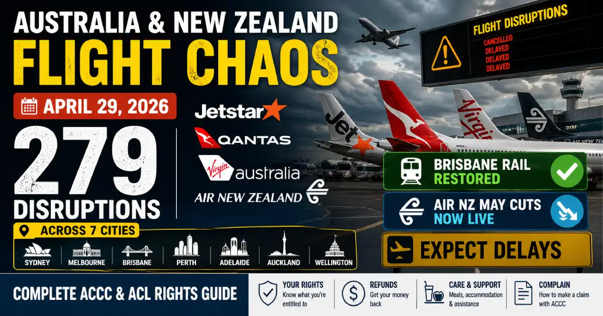 Published: April 29, 2026 🔴 ACTIVE DISRUPTION — (Day 29) National Total: 279 disruptions (257 delays + 22 cancellations) Airports Affected: Melbourne (MEL) · Sydney (SYD) · Brisbane (BNE) · Adelaide (ADL) · Christchurch (CHC) · Wellington (WLG) · Blenheim (BHE) Carriers Hit: Virgin Australia · Jetstar · Qantas · Air New Zealand Brisbane Rail: ✅ FULLY RESTORED — Airtrain operational since April 26 Air NZ May Cuts: ✅ NOW ACTIVE — Wave 2 (4% of May–June schedule) in effect from today Jetstar May Cuts: ✅ ACTIVE — 12% domestic capacity reduction May–June Fare Impact: AKL–WLG round-trip now NZ$160 (up 8–12% from April NZ$145) Context: Day 29 of the longest sustained disruption sequence in Australian and New Zealand aviation history in 2026 Compensation Regime: Australian Consumer Law (ACL) · NZ Consumer Guarantees Act · ACCC enhanced monitoring · Airline Customer Advocate