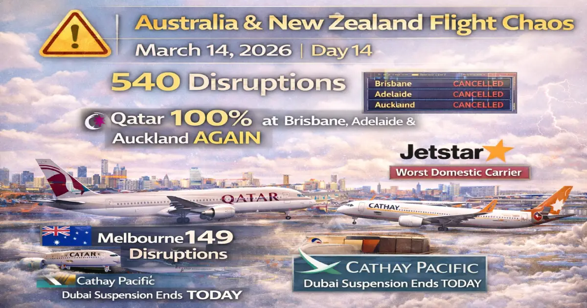 ⚠️ Australia & New Zealand Flight Chaos March 14, 2026 Day 14: 540 Disruptions — Qatar 100% at Brisbane, Adelaide & Auckland AGAIN, Melbourne 149 Disruptions, Cathay Pacific Dubai Suspension Ends TODAY, Jetstar Worst Domestic Carrier, Middle East Crisis No End in Sight