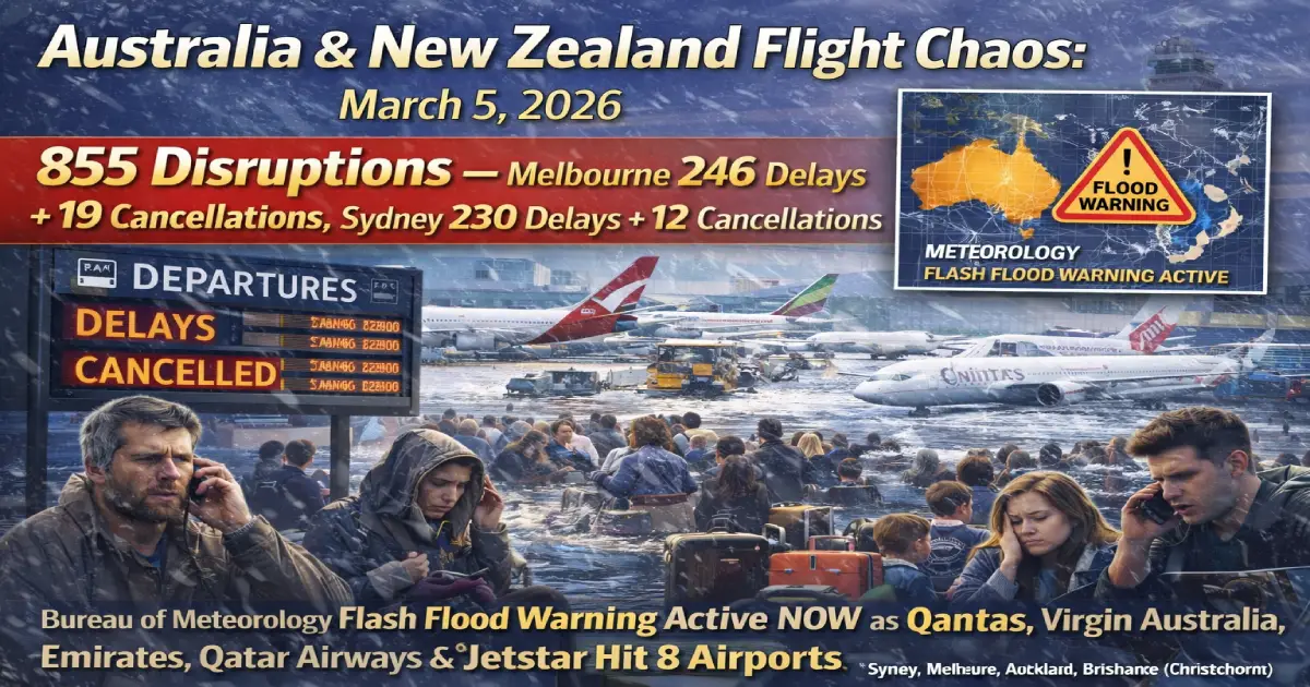 Australia & New Zealand Flight Chaos March 5, 2026: 855 Disruptions β€” Melbourne 246 Delays + 19 Cancellations, Sydney 230 Delays + 12 Cancellations, Bureau of Meteorology Flash Flood Warning Active NOW as Qantas, Virgin Australia, Emirates, Qatar Airways & Jetstar Hit 8 Airports