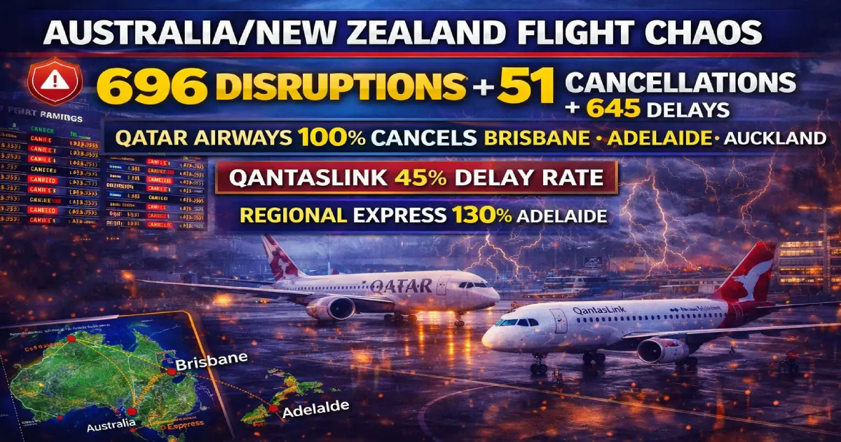 Breaking: Thousands of travelers across Australia and New Zealand face one of the worst single-day aviation disruptions of 2026 as 696 flight disruptions (51 cancellations + 645 delays) paralyze six major airports—Melbourne, Sydney, Brisbane, Adelaide, Auckland, and Wellington. Qatar Airways records 100% cancellations at Brisbane, Adelaide, and Auckland (systemic network-level decision reflecting ongoing Iran-Israel Middle East crisis ripple effects), QantasLink suffers 45% delay rate at Sydney (regional feeder network collapse), and Regional Express hits a striking 130% delay rate at Adelaide (aircraft delayed beyond scheduled window entirely!). Here’s what every traveler needs to know now.