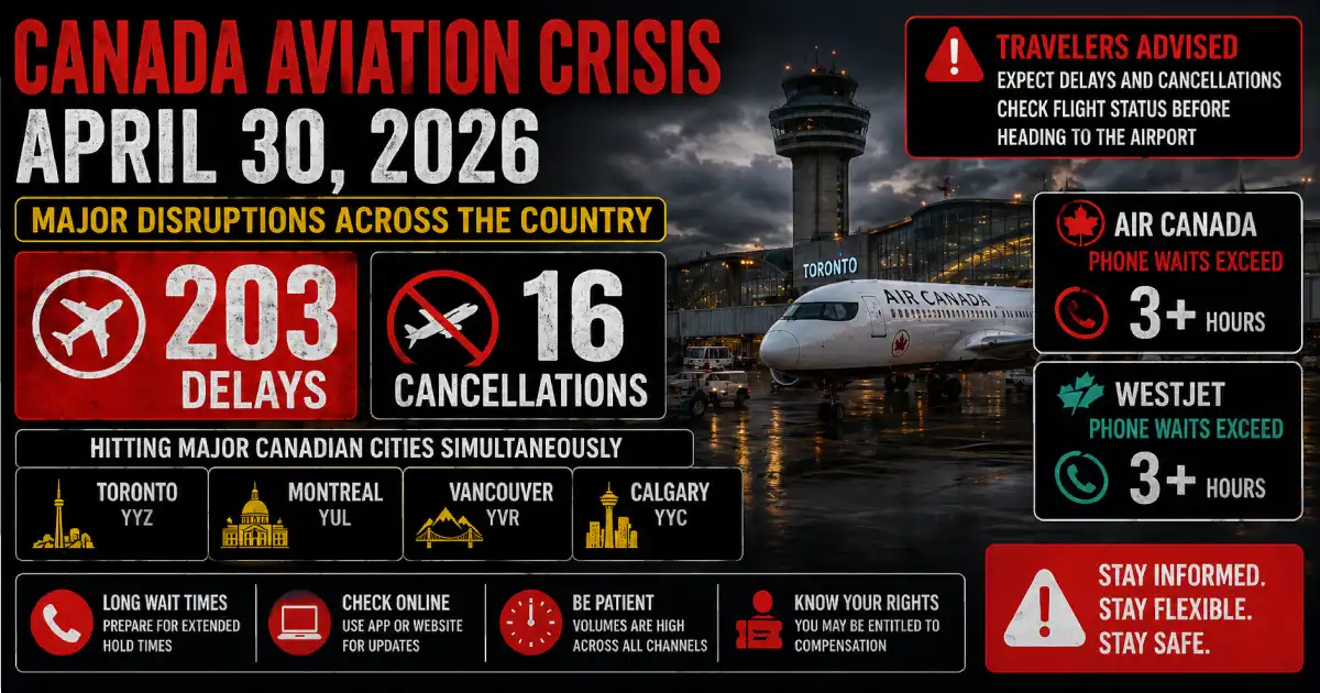 Canada’s national aviation system experienced unprecedented operational disruption on April 30, 2026, with 203 flight delays and 16 aircraft cancellations cascading across six major airports simultaneously. The systemic breakdown, affecting Toronto Pearson International Airport, Montréal–Trudeau International Airport, Vancouver International Airport, Calgary International Airport, CFB Goose Bay, and Nain Airport, represents one of the most severe domestic aviation crises in recent Canadian history and signals structural vulnerabilities in carrier capacity and airport infrastructure during peak travel periods.