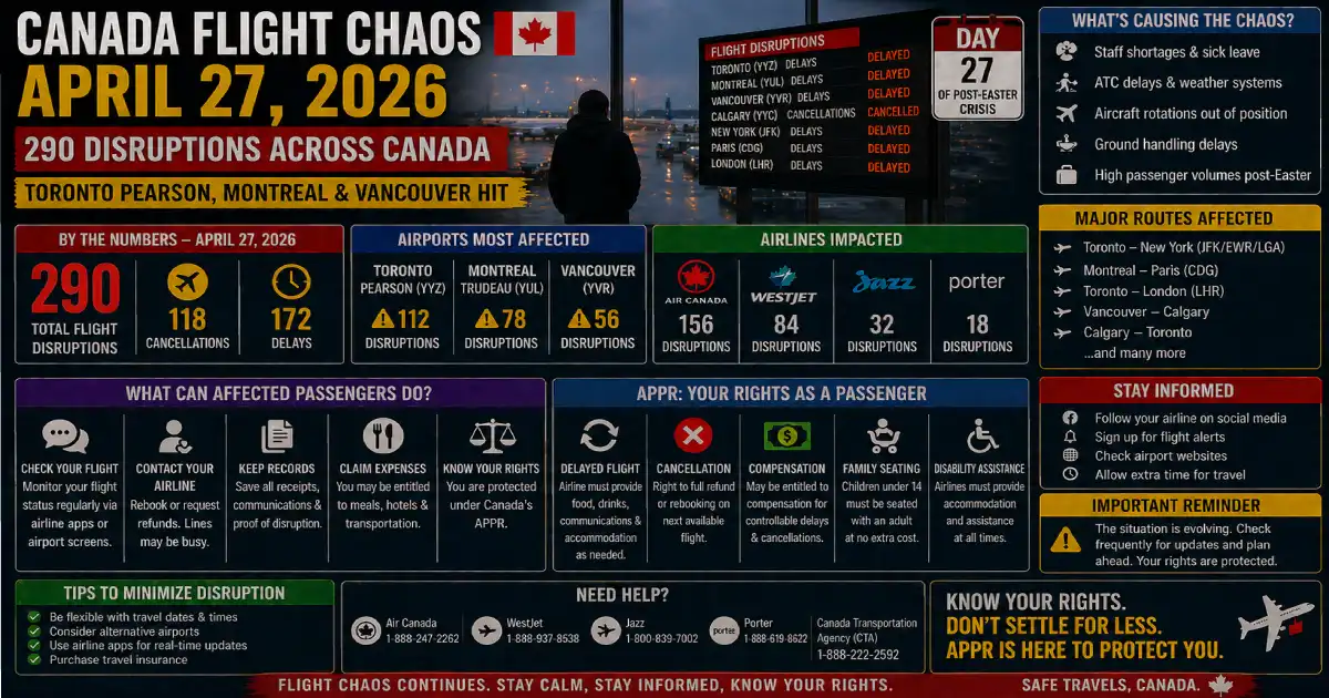 Breaking: Canada’s aviation network is recording 259 delays and 31 cancellations — 290 total disruptions on Monday, April 27, 2026, as Day 27 of the post-Easter cascade continues to grind through every major hub from coast to coast. Toronto Pearson International Airport (YYZ) is today’s national worst with 68 delays and 5 cancellations — 73 total disruptions. Montréal–Trudeau International Airport (YUL) records 73 delays and 6 cancellations — 79 total, making it the highest-cancellation airport in Canada today. Vancouver International Airport (YVR) follows with 68 delays and 5 cancellations — 73 total, mirroring Pearson’s count exactly. Calgary International Airport (YYC) records disruptions across Air Canada and WestJet’s Alberta hub. Air Canada is today’s worst carrier nationally, recording delays and cancellations across its mainline, Rouge, and Jazz feeder networks simultaneously. WestJet, Jazz Aviation, Porter Airlines, Pacific Coastal Airlines, and Delta Air Lines are all disrupted. International routes to New York, Paris, London, Toronto, Vancouver, Calgary, and San Francisco are affected. If you are flying through any Canadian airport today — or have a connection routing through Pearson, Montreal, or Vancouver — here is every number, every carrier, and exactly what you are owed under Canada’s Air Passenger Protection Regulations.