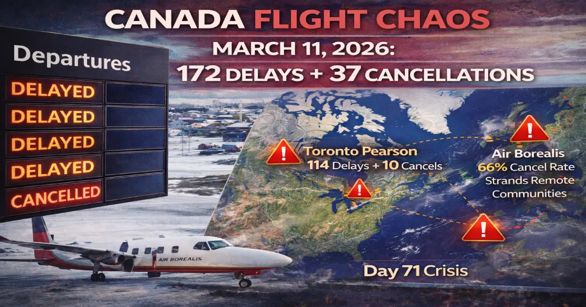 Wednesday, March 11, 2026 marked Day 71 of consecutive operational disruption across Canada’s aviation system as 209 flight problems (37 cancellations + 172 delays) stranded thousands of passengers from Toronto to the Arctic. Air Borealis—a regional carrier providing critical air links to remote northern communities—cancelled 12 of 18 scheduled flights (66% cancellation rate!), effectively severing air service to indigenous communities in Labrador and northern Quebec that have ZERO road connections to the rest of Canada.