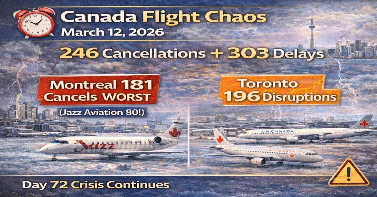 Thursday, March 12, 2026 marked Day 72 of consecutive operational chaos across Canada’s aviation system as 549 flight disruptions (246 cancellations + 303 delays) stranded tens of thousands of passengers from Montreal to Vancouver. Montreal-Trudeau International Airport recorded the worst single-airport Canadian day of 2026 with 181 cancellations and 51 delays (232 total disruptions = 78% cancellation rate!), while Jazz Aviation’s 80 cancellations represent the largest regional carrier collapse in the entire 72-day crisis.