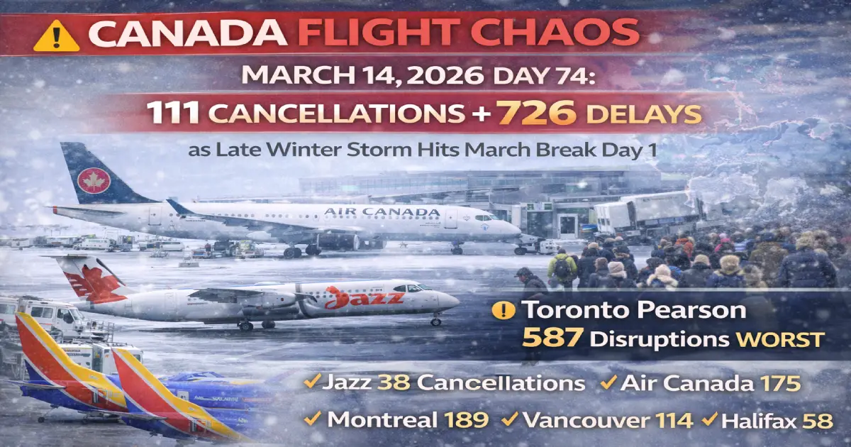 Published: March 14, 2026 (Saturday — March Break Day 1) National Total: 111 cancellations + 726 delays = 837 disruptions Worst Airport: Toronto Pearson (YYZ) — 101 cancellations + 486 delays = 587 total Worst Cancel Carrier (YYZ): Jazz Aviation — 38 cancellations (27% of schedule) Worst Cancel Rate: PSA Airlines — 66% of entire YYZ schedule cancelled Worst Delay Carrier (YYZ): Air Canada — 175 delays (53% of schedule delayed) Montreal (YUL): 19 cancellations + 170 delays = 189 total Vancouver (YVR): 12 cancellations + 102 delays = 114 total Halifax (YHZ): 11 cancellations + 47 delays = 58 total Weather: Heavy snow + freezing rain + ice pellets + thunderstorms — Ontario, Quebec, Atlantic Canada Environment Canada: Active snowfall warning — up to 15cm snow + icy surfaces Toronto Pearson activated: Departure Traffic Management Initiative (DTMI) YYZ scheduled departures today: 505 — 101 (20%) cancelled before noon Crisis duration: Day 74 of consecutive disruptions since January 1, 2026 March Break: Ontario/BC peak — Ontario schools off this week; Quebec already underway