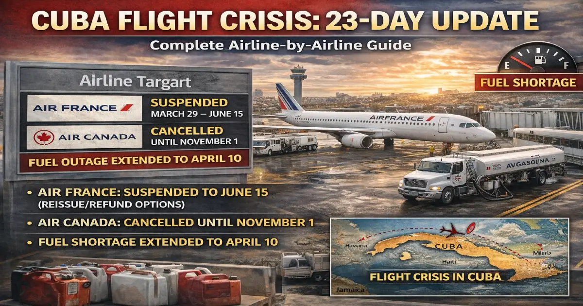 The Cuba flight crisis is no longer a 29-day disruption — it is a structural aviation collapse with no confirmed end date. When our original article published on February 10, Cuban aviation authorities said jet fuel would be unavailable at all nine international airports until March 11. That date has now passed without resolution. A new FAA NOTAM confirmed this week that the fuel outage extends at least to April 10. And today, Air France became the latest major carrier to formalise what the data has been showing for weeks: this crisis is measured in months, not days. Here is the complete 23-day update, airline by airline, airport by airport, and what it means for everyone planning to visit Cuba in 2026.
