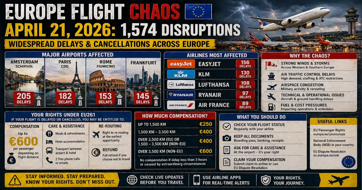 Published: April 21, 2026 🔴 ACTIVE DISRUPTION Total Disruptions: 1,574 (1,546 delays + 28 cancellations) Countries Affected: Italy · England · France · Germany · Netherlands · Portugal · Russia · Türkiye Airports Affected: 17 — full scoreboard below Worst Airport: Amsterdam Schiphol (AMS) — 205 delays + 9 cancellations = 214 total 2nd Worst: Paris CDG — 182 delays + 2 cancellations = 184 total 3rd Worst: Rome Fiumicino (FCO) — 153 delays + 2 cancellations = 155 total 4th Worst: Frankfurt (FRA) — 145 delays + 2 cancellations = 147 total Worst Carrier by Delays: easyJet — 156 delays across London, Paris, Milan, Nice Worst Carrier by Cancellations: KLM — 10 cancellations + 130 delays Lufthansa: 108 delays (last day of rebooking window — deadline TONIGHT) Other Carriers Hit: Air France · Turkish Airlines · ITA Airways · Ryanair · Wizz Air Malta · British Airways · Emirates · Delta Air Lines · American Airlines · TAP Air Portugal · Air Algérie Context: Lufthansa free rebooking deadline expires at midnight tonight (April 21) — act NOW