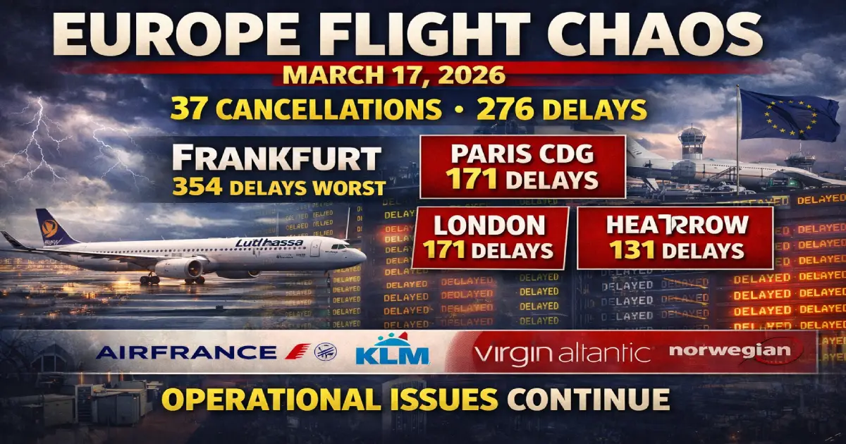 Europe Flight Chaos March 17, 2026: 37 Cancellations + 276 Delays—Frankfurt 354 Delays WORST, Paris CDG 171 Delays, London Heathrow 131 Delays, Air France KLM Virgin Atlantic Norwegian Hit, Operational Issues Continue