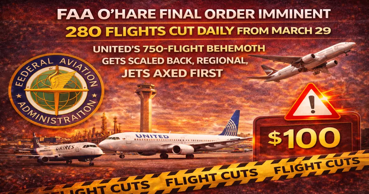Published: March 11, 2026 Written Comment Deadline: TODAY — March 11, 2026 Final Order: Imminent — expected Federal Register publication late March Cap Takes Effect: March 29, 2026 (IATA Summer Season start) Cap End Date: October 25, 2026 Current Peak Schedule: 3,080 daily operations Last Summer (2025): 2,680 daily operations FAA Cap: 2,800 daily operations maximum Flights to Cut: 280 operations per peak day (140 takeoffs + 140 landings) Total Summer Impact: ~50,400 flights affected across 180 peak days Passengers at Risk: 7–10 million (estimated 140–200 seats per affected operation) Primary Culprit: United Airlines — planned 750 daily flights (largest O’Hare schedule ever flown by any carrier, +200 vs nearest competitor) Secondary Culprit: American Airlines — planned 500+ daily flights, targeting 183 destinations What Gets Cut First: Regional jets on short-haul routes — highest frequency, fewest seats per operation International Flights: NOT affected — cap applies to US carriers only Foreign Carrier Flights: NOT affected — Lufthansa, British Airways, Air France operate normally Gate War: United CEO Scott Kirby’s January “line in the sand” quote triggered this entire crisis Who Wins: American Airlines — United forced to cut more proportionally Who Loses: Regional passengers on SkyWest, PSA, Envoy feeders into ORD Fare Impact: Seat capacity shrinking → 15–30% fare increase projected on peak ORD routes The Newark Precedent: FAA capped EWR in summer 2025 — regional reductions and frequency consolidation followed. O’Hare is next. 2028 Relief: O’Hare’s multibillion-dollar terminal expansion completes 2028 — caps may be permanent until then