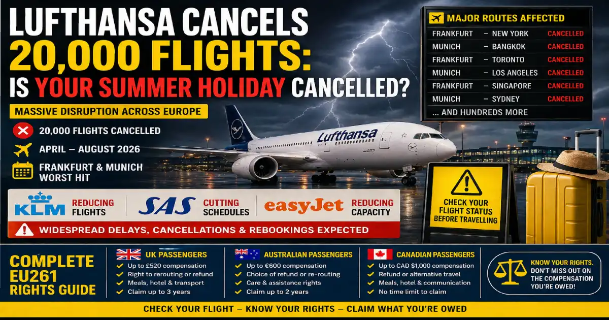Canadian passengers face similar dynamics to Australian passengers for European connections via Frankfurt. Air Transat’s 6% capacity cut May–October is particularly relevant for Canadian travellers — if you have an Air Transat transatlantic booking, check transat.com for any changes to your specific flight.