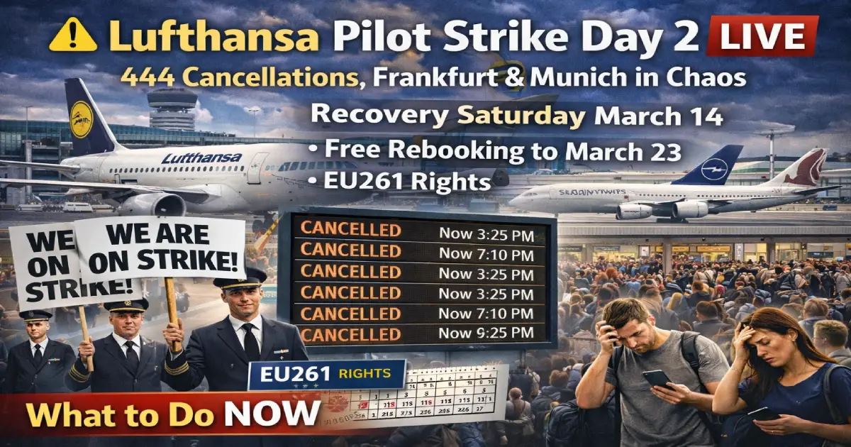 Published: March 13, 2026 (Friday — Strike Day 2 FINAL DAY) Strike Duration: 48 hours — midnight March 12 to 11:59 PM March 13 Total Cancellations (Both Days): 444 flights cancelled + 45 delayed Daily Rate: ~300 cancelled departures per day (union estimate) Frankfurt (FRA) Day 1: ~400 of 1,165 scheduled movements cancelled Munich (MUC) Day 1: ~230 of ~800 flight movements cancelled Lufthansa operated (Day 1): 246 cancellations (44% of flights) + 6 delays Lufthansa CityLine (Day 1): 18 cancellations (52% of flights) Still operating: 50%+ of full programme | 60% of long-haul Pilots on strike: 5,000+ (Lufthansa, Lufthansa Cargo, Lufthansa CityLine) NOT affected: Austrian, Eurowings, SWISS, Air Dolomiti, Discover, Edelweiss, LH City Airlines Middle East flights: EXEMPT from strike (FRA→RUH Riyadh operating) Recovery: Normal schedule expected from Saturday March 14 ✅ Free rebooking window: March 10–23, 2026 Dispute root cause: Pension scheme change since 2017 — no resolution in 9 years