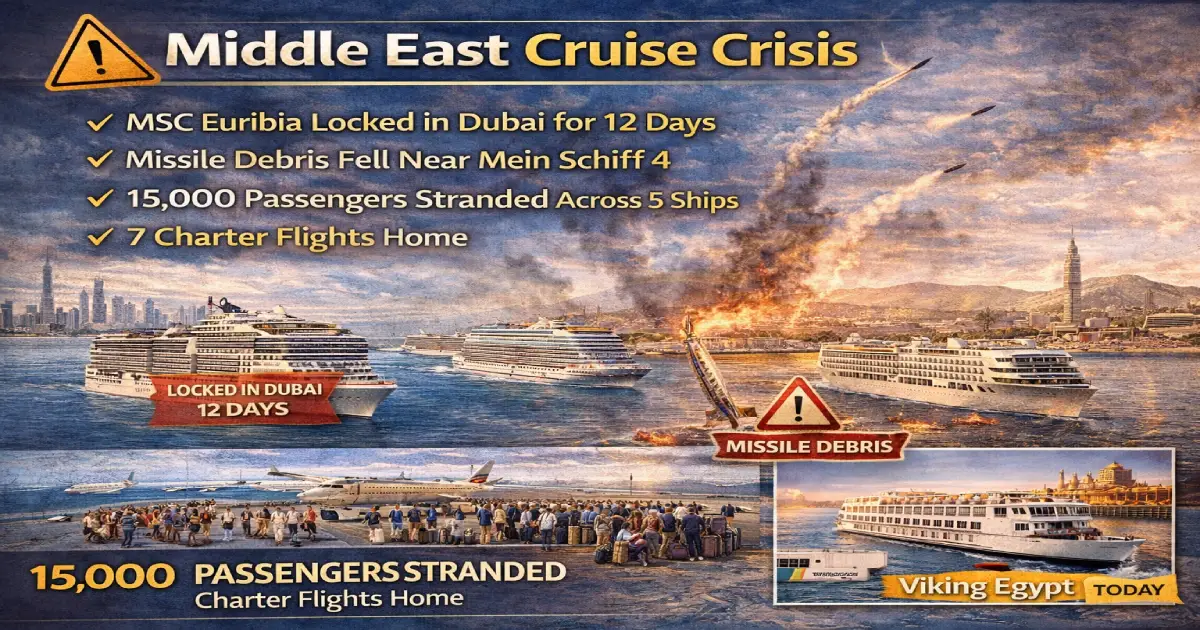 Breaking: The Middle East crisis created the largest cruise disruption since COVID-19 — five ships simultaneously locked in the Gulf, 15,000 passengers unable to leave, a 3am missile alert waking British passengers in their cabins, and Iranian missile debris confirmed falling near a TUI cruise ship in Abu Dhabi port. MSC Cruises funded seven charter flights to repatriate 1,500 guests. Every remaining Gulf cruise season has been cancelled. And today — March 12 — Viking River Cruises resumes Nile Egypt operations as the first major operator to reverse course. Here is the complete cruise crisis guide: every ship, every line, every refund right, and exactly where cruise travel stands today.