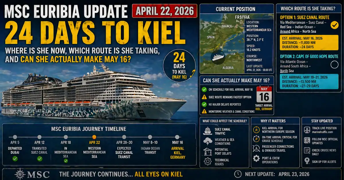 Published: April 22, 2026 MSC Euribia departed Strait of Hormuz: April 18, 2026 Days since escape: 4 Days remaining to May 16 Kiel departure: 24 Last confirmed AIS position: Arabian Sea, en route to Muscat (OMMCT) — reported ~April 20 Confirmed sailing speed: 18.4–22.1 knots (varying AIS reports) Total distance Strait of Hormuz → Kiel: ~8,300 nm (Suez route) OR ~13,000+ nm (Cape route) MSC official route statement: ❌ Not confirmed Most likely route per maritime analysts: Cape of Good Hope via South Africa May 16 season start: ✅ CONFIRMED ON by MSC official statement May 9 sailing status: ❌ Still cancelled — NOT reinstated First confirmed sailing with passengers: May 16 from Kiel / May 17 from Copenhagen 7-night itinerary: Kiel → Copenhagen → Hellesylt → Ålesund → Flåm → return Kiel