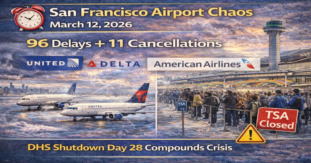 Breaking: San Francisco International Airport records 107 total flight disruptions (11 cancellations + 96 delays) Thursday as the DHS Shutdown enters Day 28—with 50,000 TSA agents working without pay and security wait times hitting 3 hours at Houston Hobby and New Orleans airports. United Airlines, Delta, American, and other major carriers face operational chaos as the partial government shutdown compounds nationwide weather disruptions. Here’s what every West Coast traveler needs to know now.
