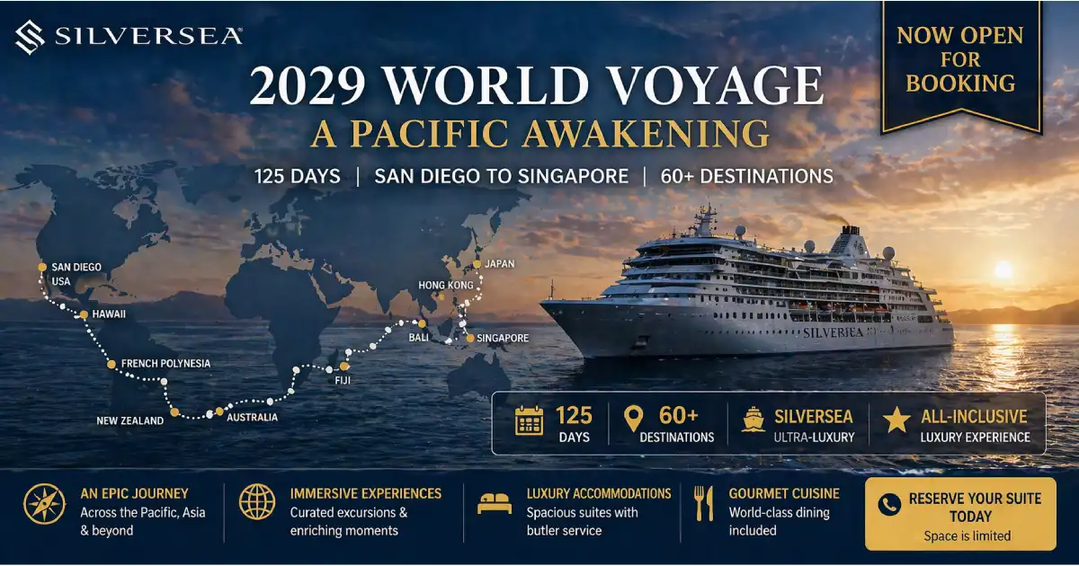 Published: April 22, 2026 Voyage name: A Pacific Awakening Ship: Silver Whisper Departure: San Diego, California — January 5, 2029 End port: Singapore — May 11, 2029 Duration: 125 days Destinations: 60+ across 19 countries Regions: Polynesia · Micronesia · Melanesia · Australia · New Zealand · Asia UNESCO World Heritage Sites: 15+ Overnight stays: 17 Signature events: 6 exclusive cultural events + 1 included overland experience Voyage theme: “From Kingdoms to Dynasties” Number of chapters: 8 Guest capacity: 392 Crew-to-guest ratio: Near 1:1 Booking open: ✅ General sales opened April 21, 2026 Venetian Society pre-sale: April 14, 2026 (already underway) Book at: silversea.com/lp-world-cruise-2029 Voyage segments: Available for sale as full voyage or individual chapters