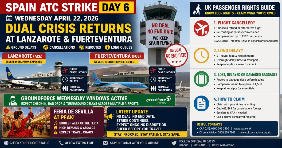 Spain ATC Strike Day 6 — Wednesday April 22, 2026: Dual Crisis Returns at Lanzarote & Fuerteventura — Groundforce Wednesday Windows Active — Feria de Sevilla at Peak — No Deal, No End Date — Complete UK Passenger Rights Guide