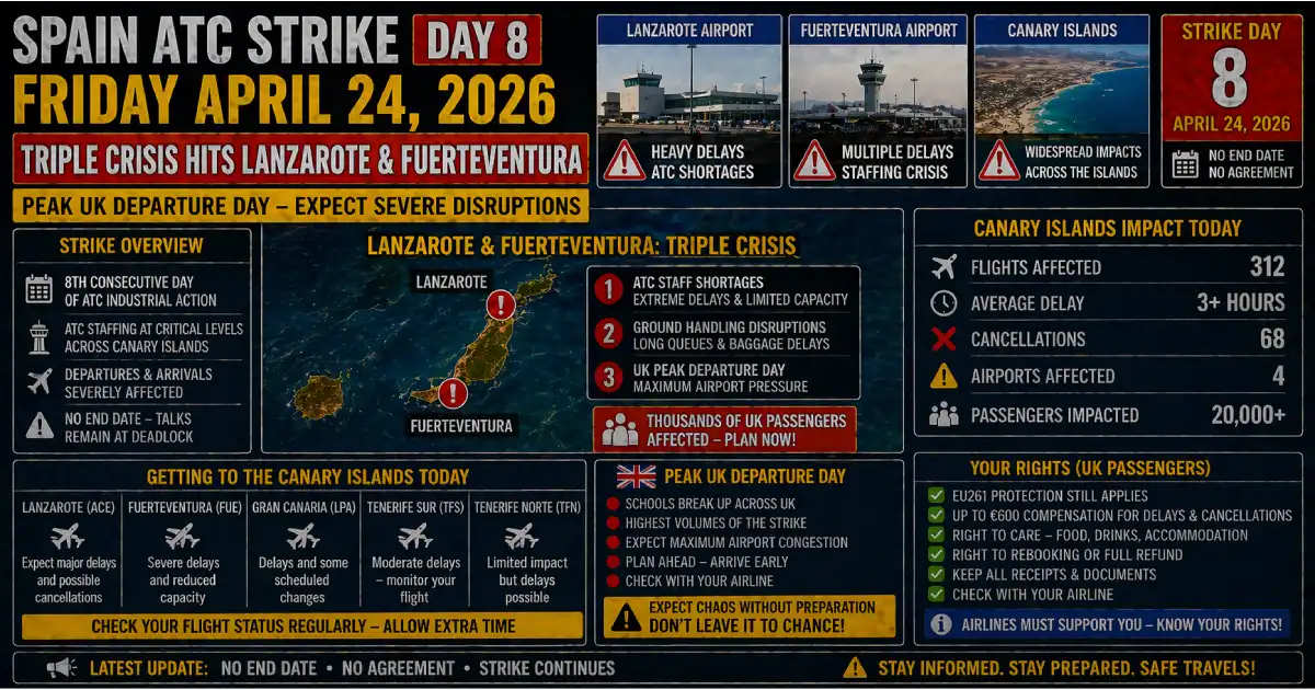 Day 8 of the SAERCO ATC strike lands on the most complex Friday of the entire dispute. Three separate industrial actions — SAERCO air traffic controllers, Groundforce baggage handlers, and Azul Handling ground staff — are all in active disruption periods simultaneously today. Lanzarote and Fuerteventura face maximum simultaneous exposure from all three. Ryanair passengers at those airports have triple-layer risk that no other carrier’s passengers face.