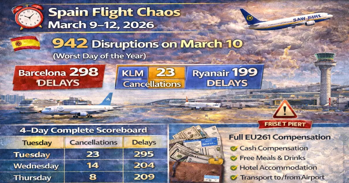 Breaking: Spain has suffered its worst four consecutive days of aviation disruption in 2026. March 10 alone recorded 942 disruptions across five airports — 56 cancellations and 886 delays — the highest single-day total in Spain this year. Barcelona leads all European airports for delays. KLM is the worst carrier for cancellations. Ryanair has the highest delay count of any airline. Here is the complete four-day scoreboard, airport by airport and airline by airline, plus the full EU261 guide telling you exactly what every affected passenger is owed.