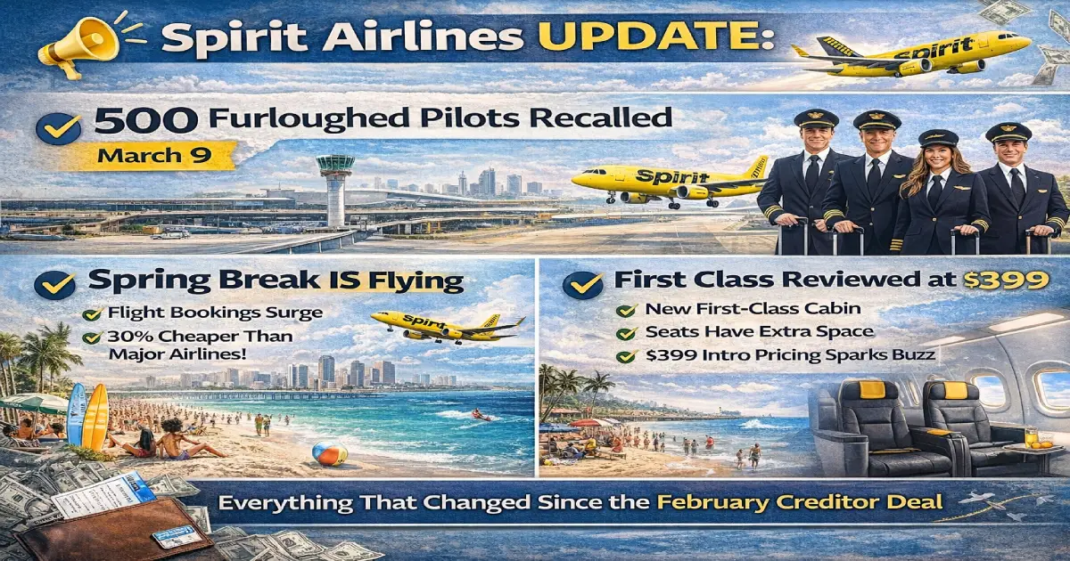 Update: On February 25, this site published the original Spirit Airlines creditor deal story — debt slashed to $2.1 billion, fleet cut to 94 aircraft, Spirit First Class confirmed. Three weeks later, the airline has recalled 500 furloughed pilots, confirmed Spring Break operations are intact, and Business Traveller has published the first independent first-class review. Here is everything that has changed since February 25 — and exactly what it means for your Spirit booking right now.