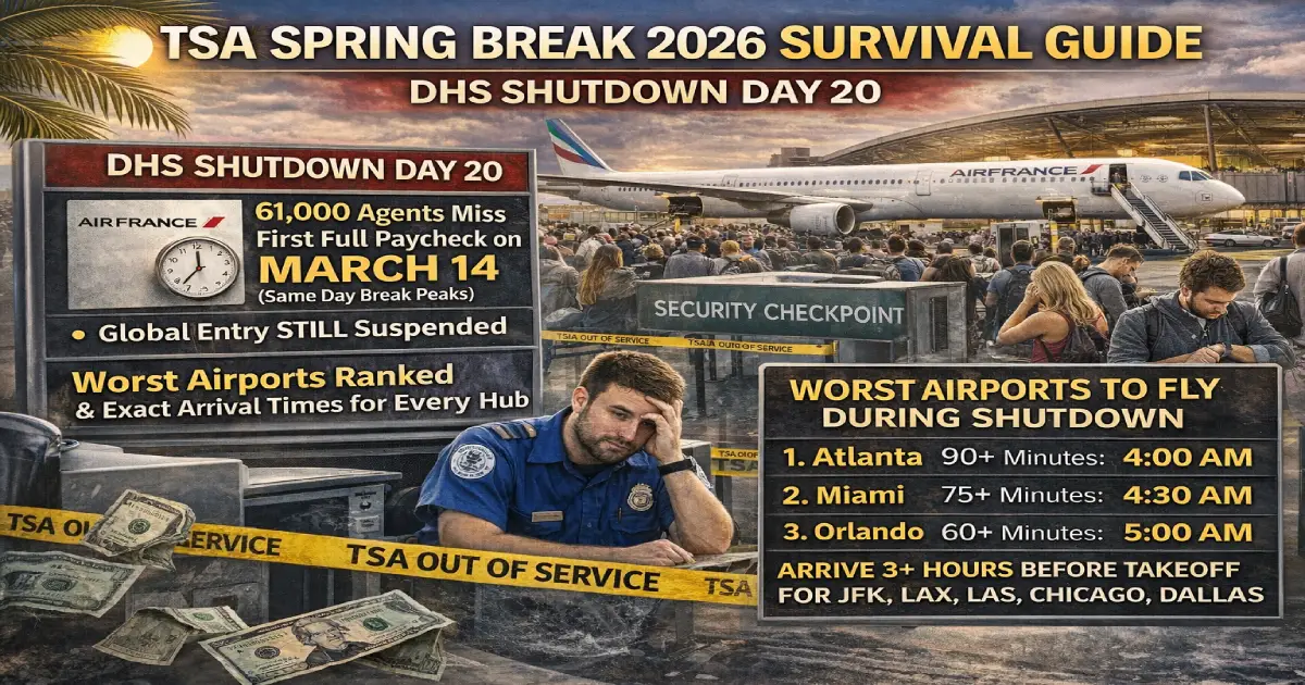TSA Spring Break 2026 Survival Guide: DHS Shutdown Day 20 β€” 61,000 Agents Miss First Full Paycheck on MARCH 14 (Same Day Break Peaks), Global Entry STILL Suspended, Worst Airports Ranked & Exact Arrival Times for Every Hub