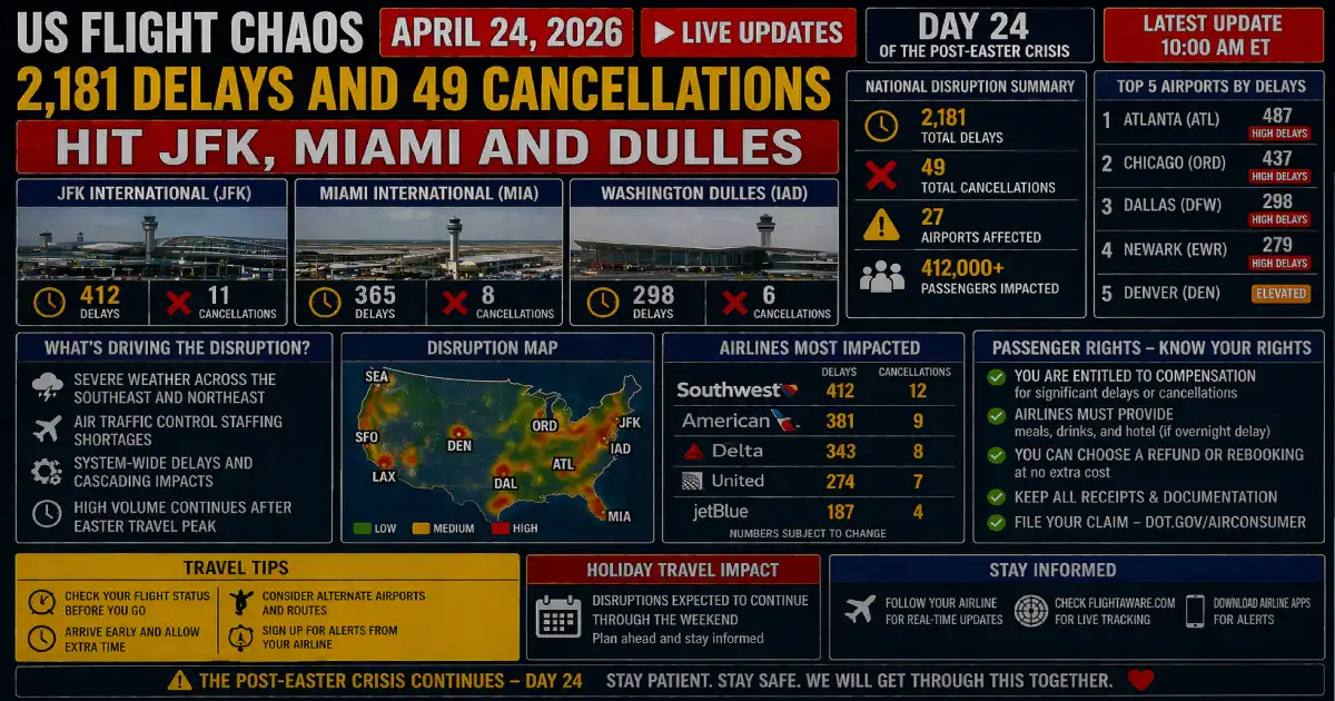US Flight Chaos April 24, 2026: 2,181 Delays and 49 Cancellations Hit JFK, Miami and Dulles — Day 24 of the Post-Easter Crisis