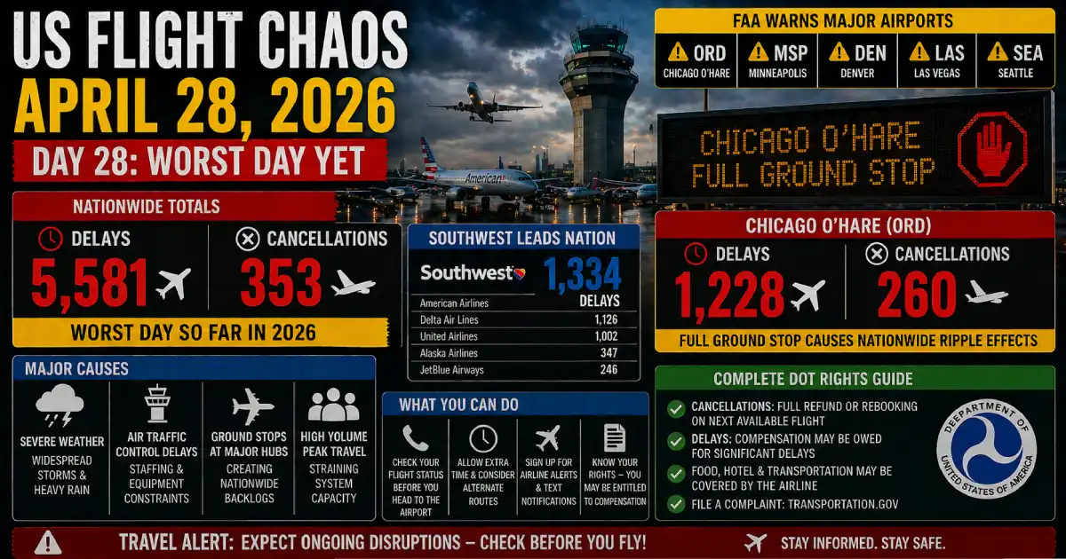 US Flight Chaos April 28, 2026: 5,581 Delays & 353 Cancellations — Chicago O’Hare Full Ground Stop: 1,228 Delays + 260 Cancellations — Southwest 1,334 Delays Leads Nation — Day 28 Worst Day Yet — FAA Warns ORD, MSP, DEN, LAS & SEA — Complete DOT Rights Guide